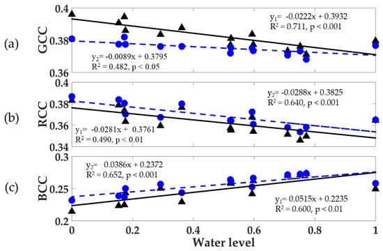 The relationship between (a) GCC, (b) RCC, and (c) BCC seasonal values with the seasonal normalized water level for the mangrove forest (black triangle, y1 relationship) and mangrove-water canopy (blue dot, y2 relationship). The data were calculated monthly from July 2015 to August 2016.