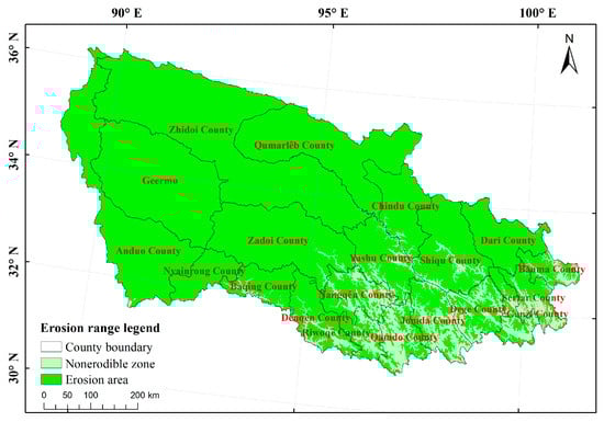 The freeze-thawing erosion area is an area characterized by intense freeze-thawing in a cold climate, where freeze-thawing is the most important erosivity and has a corresponding freeze-thawing erosion landform morphology []. Therefore, to determine whether a region belongs to the freeze-thawing erosion area, the most important thing is to see whether the erosion power of the region is dominated by freeze-thawing activity []. Now, there are many methods to observe the scope of freeze-thawing erosion area. A common method is to take the periglacial area as the lower limit of erosion area, but the lower boundary of the periglacial area is about 200 m lower than that of the permafrost area []. The lower boundary of the permafrost area is a range of −2.5 °C. Based on the previous research results [], this study used the longitude (X), latitude (Y) and altitude (H) obtained from DEM data to calculate the boundary of the annual average temperature of −2.5 °C, and then subtracted 200 m to obtain the frozen melt and the lower bound of erosion. The calculation equation is: