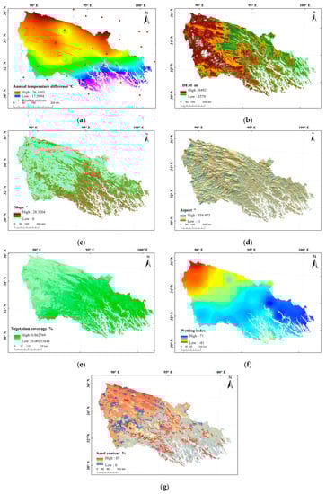 Studies have shown that freeze-thawing erosion is greatly affected by many factors, such as climate, hydrology, topography, vegetation and so on []. Therefore, this paper selected seven factors as the influencing factors of freeze-thawing erosion, including annual temperature range, elevation, slope, aspect, vegetation index, soil moisture index and sand content.