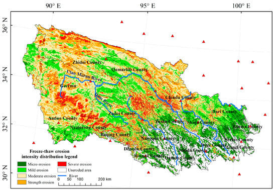 Soil loss per unit time and per unit area is usually taken as the grading basis of freeze-thawing intensity. However, there are few observational reports on freeze-thawing erosion loss, so the classification of freeze-thawing intensity is very difficult []. In this paper, the method of Natural Breaks in ArcGIS was used to assign the calculated results in grades. Natural Breaks Classification, which divides data at locations where there are relatively large differences in values, best groups similar values and maximizes differences between categories. The degree of freeze-thawing erosion is divided into different grades. The freeze-thawing erosion intensity was classified into five grades, namely, micro erosion, mild erosion, moderate erosion, strength erosion and severe erosion. The classification map of freeze-thawing erosion intensity in the study area was drawn, as shown in Figure 4.