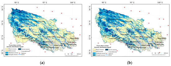 In this study, the superposition of freeze-thawing erosion effects in 2006 and 2016 with severe climate problems was selected for comparison. The freeze-thawing erosion area of Qinghai-Tibet Plateau is widely distributed, 16.394 × 105 km2, accounting for 63.68% of the total area, while the nonfreeze-thawing erosion area is mainly distributed in the Qaidam Basin, the lower reaches of the Yarlung Zangbo River Basin and the Hengduan Mountain area []. Wang Liyan et al. found that the freeze-thawing erosion area of the Qinghai-Tibet Plateau was 149.02 × 104 km2, the area sensitive to freeze-thawing erosion was 56.80 × 104 km2, and the area sensitive to moderate and above was 27.39 × 104 km2, accounting for 48.22% of the total area of freeze-thawing erosion. The area of moderate sensitive areas was 18.21 × 104 km2, accounting for 32.06% of the total area of freeze-thawing erosion-sensitive areas. The intensity sensitive area was 9.18 × 104 km2, accounting for 16.16% of the total area of freeze-thawing erosion-sensitive area []. The experimental results are shown in Figure 6, on the whole, the degree of freeze-thawing erosion in 2016 is stronger than that in 2006, but the difference is relatively small.