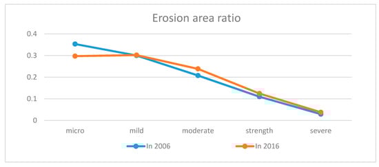 Comparing the freeze-thawing erosion region in the two years, as shown in Figure 7, the freeze-thawing erosion intensity area ratio in 2006 and 2016 showed the same trend and similar proportion.