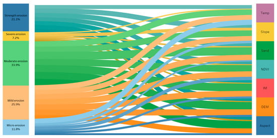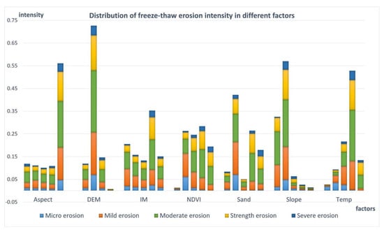 The seven factors were reclassified by ArcGIS software for further analysis and to discuss the relationship between the erosion intensity of the study area and each single factor. By using superposition analysis, the relationship between freeze-thawing erosion area and different influencing factors in the study area is shown in Figure 9 and Table 3. The area distribution of freeze-thawing erosion intensity in different grades of each factor is shown in Figure 10 and Table 3.