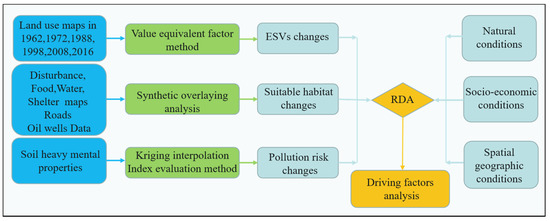 The comprehensive environmental effects were evaluated in this paper from three aspects, the change of ESVs, habitat suitability for water birds, and pollution risk of soil heavy mental. The ESVs and habitat suitability were assessed based on the value equivalent factor method and synthetic overlaying analysis of factors, respectively. The pollution risk was assessed by kriging interpolation and index evaluation. Then, the driving factors of comprehensive environmental effects were studied through redundancy analysis (RDA) from natural, socio-economic, and spatial geographic conditions, as shown in Figure 2.