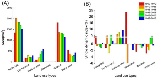 The area of each land use (A) and the single dynamic index change (B) from 1962 to 2016.
