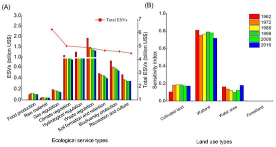 The ESVs results were 6.24, 5.01, 4.87, 4.67, 4.60, and 4.46 billion US$ in 1962, 1972, 1988, 1998, 2008, and 2016, respectively. The ESVs had lost about 1.78 billion US$, accounting for 28.58% since 1962 (Table 3). The values of waste regulation and hydrological regulation were the highest ones, followed by climate regulation, biodiversity protection, soil formation and retention, recreation and culture, gas regulation, and raw material production (Figure 5A). The ESVs values of ecological service functions showed a declining change, however the ESVs of raw material had an increasing trend (0.33%) from 1962 to 2016. The declining ESVs were mainly caused by the loss of wetland, which has the highest ecological services. Additionally, forestland and water areas were converted to cultivated land, which led to an increase in raw materials. The values of regulating services decreased (22.50%, 33.01%, 29.43%, and 31.58%), and the values of supporting services decreased (20.47% and 26.00%) 1962–2016. Regulating services and supporting services were contributed to the ESVs with the large proportion that were observed. The ESVs of wetland and water area decreased significantly, with the proportions of 36.73% and 21.47%, and the ESVs of cultivated land increased 17.89% (Table 4). The wetland contributes the most to the ESVs, followed by cultivated land and water area. Compared with other land use types, the ESVs of wetland always showed negative changes during 1962–2016. The area with high ESVs has gradually decreased, and the area with low ESVs has increased 1962–2016.