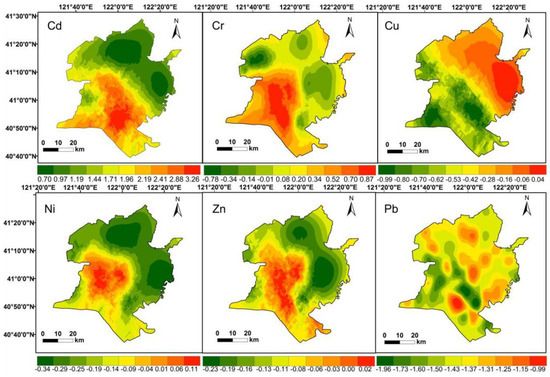 where is the geo-accumulation index of a sampling point, Ci represents heavy metal i concentration in topsoil, Bi is the background value of heavy metal i [51], which is obtained from Chinese soil element background value, and 1.5 is the background matrix correction factor. is the single potential ecological risk factor, is the toxic-response factor for a given substance, which accounts for the toxic requirement and the sensitivity requirement, and RI represents the sum of all risk factors, as shown in Table 2. represents the contamination factor, and are the concentration and a reference value for soil heavy metal, respectively. In this paper, the soil background values of Liaoning province were considered as references to evaluate the present pollution conditions and the potential for ecological impacts.