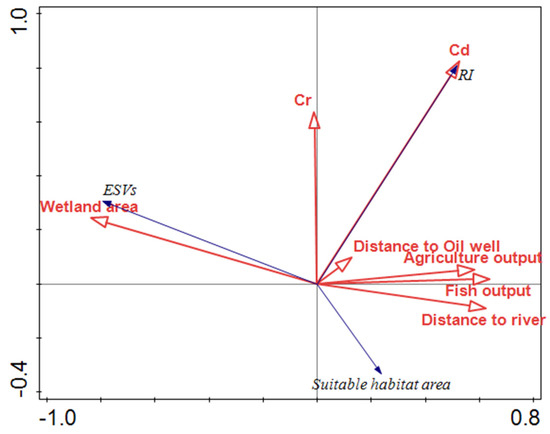 The results showed that the wetland area, Cd concentrations, Cr concentrations, distance to oil wells, distance to a river, and agricultural and fishery output have power in explaining the ESV, RI, and suitable habitat (p < 0.05). Approximately 74.70% of the variation were explained by the selected variables. The first two ordination axes explained over 78.0% of the correlation with both the driving factors of wetland loss and ecological effects (p = 0.01). The results indicated that the percentage of wetland area had a greater impact on environmental effects, with contributions of 44.5%, and the Cd concentrations also had a greater impact, with contributions of 37.3% in Table 6. As shown in Figure 9, RI was positively related to Cd, Cr, agriculture and fishery output, and the distance to oil wells and negatively related to the wetland area. Wetland area has a negative relationship with the potential ecological risk. A positive correlation between wetland area and ESVs was found, which demonstrated that the change of wetland is likely to lead to ESV loss. Suitable habitat area was positively related to the distance to rivers, and negatively related to the distance to an oil well, which indicated that the water condition is an important factor for bird habitats and oil exploration is likely to lead to suitable habitat loss. The wetland loss and driving factors, such as agriculture, oil wells, and industrial exploitation have resulted in cumulative environmental effects.