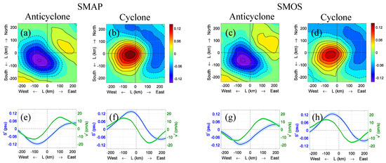 (Top) SSS anomalies (psu) associated with anticyclonic (a,c) and cyclonic (b,d) composite eddy in the South Indian Ocean (25–15°S, 90–100°E). The left and right pairs of panels compare SMAP (left) and SMOS (right) SSS analyses. (Bottom, e–h) Zonal sections across the composite eddies. In each panel, the green and blue curves show the eddy meridional velocity (cm/s) and SSS anomaly (psu), respectively. The blue (green) shaded area represents standard errors of the composite SSS (meridional velocity).