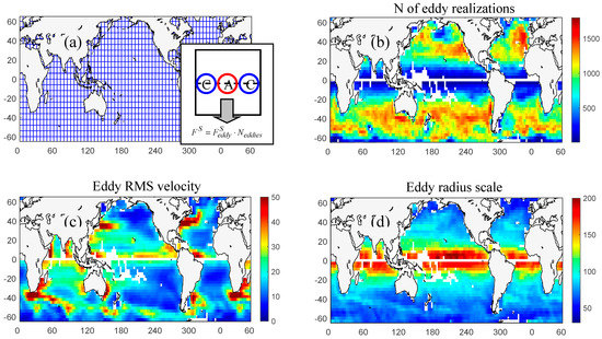 To utilize this idea globally, we divide the ocean into 6°-longitude × 6°-latitude geographic bins. The bin size of 6° (≈600 km) is chosen because it corresponds to the average eddy propagation distance of 550 km derived from the satellite altimetry data [9] and thus seems to be optimal. Eddy composites are constructed in each geographic bin, and the eddy flux across the bin is estimated using the idea of the densely packed eddies as described above. A schematic illustration of the algorithm as well as maps of eddy properties relevant to our study is provided in Figure 3.