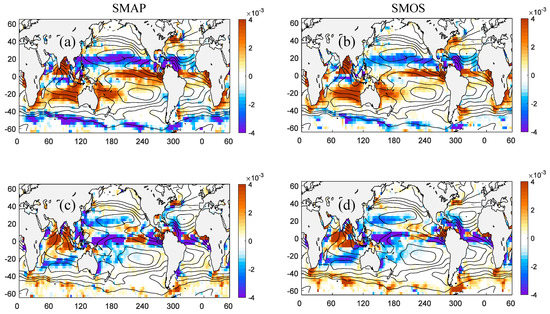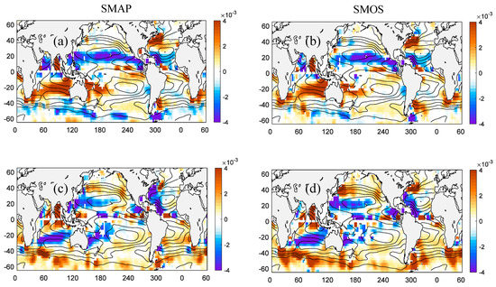 Eddy salt fluxes in the surface mixed layer estimated through the eddy composite analysis from SMAP (a,c) and SMOS (b,d) SSS data during the common observational period from 2015 to 2019. (a,b) Meridional salt flux. Positive (negative) values indicate northward (southward) salt flux. (c,d) Zonal salt flux. Positive (negative) values indicate eastward (westward) salt flux. Units are kg m−2 s−1. Shown on top of each figure are contours of mean SSS (C.I. = 0.5 psu).