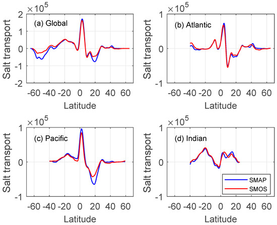 Zonally integrated eddy salt fluxes in the surface mixed layer evaluated (a) globally and over the (b) Atlantic, (c) Pacific, and (d) Indian Ocean from SMAP (blue) and SMOS (red) SSS data. The fluxes are in 1-m layer so the units are kg m−1 s−1.