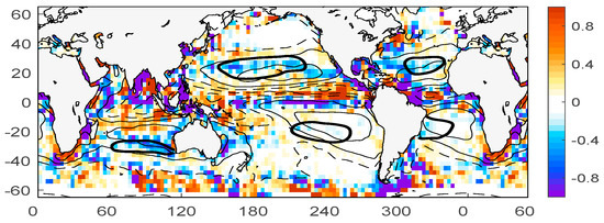 Figure 7 shows the divergence of salt due to eddy transport. Shown on top are contours of the mean E–P. The distribution of the divergence of the salt flux is patchy (taking a derivative in space amplifies small scales), but the large-scale patterns are apparent. The divergence of salt is negative in the five subtropical oceans, roughly coinciding with the SSS-maximum regions. These regions are defined in Figure 7 as the regions bounded by specific isohalines (black bold contours). They are 37 psu in the NA, 35 psu in the NP, 36.8 psu in the SA, 36.0 in the SP, and 35.6 in the SIO. The choice is somewhat subjective, yet it generally corresponds to the previous studies [39] and is suitable for further evaluation of the eddy effects. In each of the five SSS-maximum regions, we evaluate the contribution of the eddy salt flux and compare it to the surface forcing. The relevant terms in the surface mixed layer salinity budget are the eddy-induced divergence of salt, and the surface forcing, which is determined as the “virtual salt flux” [40], where is the reference salinity and is the mixed layer depth (MLD). The eddy salt flux divergence in each area is estimated as the integral over the area (equivalent to the flux through the boundary of the area) and is compared to the area integral of the surface forcing. The influence of the MLD variability is not taken into account, fixing it to the mean value of 50 m.