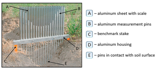 The main research question of this research was how to automate and improve the measurement process of gully cross-sections (GCs), while achieving high measurement accuracy. Therefore, the main research objective (1) was to develop the pixel-based (interval VHR DSMs) methodological approach that will allow automated measurement of vertical spatio-temporal changes in a large number of GCs. A conceptual basis for the development of the VERTICAL method was based on the principle of profilometer, as one of the most commonly used devices for manual field measurement of vertical spatio-temporal changes within chosen cross-sections [22,24,25,26,27,31,32,33,34,79]. A profilometer is a simple device that allows interval field measurement of depth at point samples distributed within identical distance intervals along the chosen cross-section [26,80,81]. Older versions of profilometer devices have aluminum pins (Figure 1) that allow mechanical measurement of depth by lowering the pin until it reaches the surface [79,81,82]. Newer versions are equipped with optical devices, e.g., laser distance gauge [22,34].