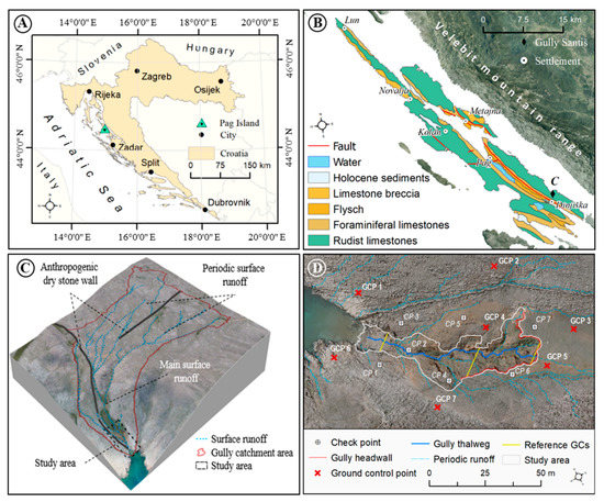 The study area (A) location of Pag Island within Croatia; (B) geological formations of Pag Island; (C) gully Santiš and its catchment area; (D) study area.