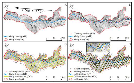 In the second step, MSL vertices are extracted, along with their XY coordinates (Figure 5B). Precise coordinates are needed for the later creation of GCs, perpendicular to the determined LDM value. If gully thalweg is used as MSL (as in this study) then the interval between created GCs is defined by extracted vertices that represent curves defined by the flow direction. In that case interval between created GCs is not manually and subjectively determined by the user, but it is rather determined by the morphological and hydrological characteristics of the studied gully. Otherwise, if a straight line is used as an MSL, the user has to define manually the interval at which GCs will be created.