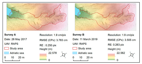 In order to reduce systematic error of DSMs created from acquired data, collected aerial images were georeferenced accordingly to the seven fixed ground control points (GCPs) scattered throughout the study area (Figure 2D). The number of GCPs was determined following examples of good practice [45,103]. Along with seven GCPs, additional seven fixed checkpoints (CPs) were marked in the field as a quality measure [51]. The number of GCPs and CPs is also conditioned by land cover type in the wider area of the case study. Namely, shallow-brown soil predominates in this area. On such, extremely dynamical and erosion susceptible surface, it was not possible to mark and construct a lot of permanent, fixed geodetic points, i.e., to measure the GCPs and CPs using the proposed methodology. Therefore, the GCPs were limited to predominantly rocky areas within the study area. All GCPs and CPs were identical for both surveys, thus ensuring consistency of created models. GCP and CP locations were marked before the initial and final aerial survey by 15 × 15 cm X signs (Figure S1). Additionally, a Bosch hammer was used to drill a small hole for the rod of the RTK-GPS rover at the center of the marked cross. Red weather-resistant spray paint was used for marking X signs, which stands out well from surrounding light carbonate rocks (Figure 2D). Spray paint applied on the carbonate rock base remained visible after two years, but it was enhanced with new spray before the final aerial survey. Precise coordinates (XYZ) of every selected GCP and CP were collected before every survey with Stonex S10 RTK GPS, with 0,8 cm horizontal and 1,5 cm vertical precision [104], where every point was observed for a minimum of 5 minutes (300 epochs). These data were used for the validation of RTK GPS precision. Validation of RTK GPS coordinates has shown that the precision of collected coordinates slightly deviates from the stated factory precision (horizontal precision = 1.2 cm; vertical precision = 1.8 cm). Such deviation is probably caused by the remoteness of the study location, in relation to the three closest base stations of the Croatian positioning system (CROPOS) used for the correction of the collected XYZ coordinates. Identical GCPs and CPs were used in both aerial surveys. Acquired aerial photos were later used for photogrammetric processing and the derivation of VHR DSMs.