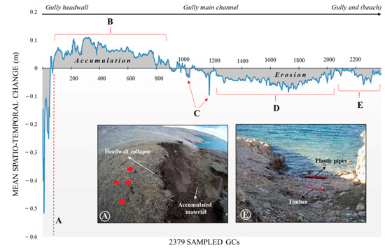 Calculated mean spatio-temporal changes measured within 922 GCs vary significantly from the gully headcut to the gully terminus (Figure 8). This correlates with the overall heterogeneity of the gully erosion process [92]. Erosion prevails in 356 GCs (38.61%), with the mean erosion rate per sampled GCs between 5.13 ± 5 and 51.65 ± 5 cm in the study period−1. On the other hand, accumulation prevails in 566 GCs (61.38%), with the mean accumulation rate per sampled GCs between 5.04 ± 5 and 13.43 ± 5 cm in the study period−1. Variations in extracted spatio-temporal change values reflect the different processes and trends that have occurred between the two surveys. Although gully Santiš represents a relatively simple and short gully, results derived by VERTICAL are showing that spatial distribution and intensity of the processes that influence its formation are more complex than expected. For example, within the first 51 analyzed GCs (Figure 8A) maximal mean erosion values were recorded, ranging between 9.21 ± 5 and 51.64 ± 5 cm in the study period−1. The maximal erosion value measured within point samples of that 51 GCs is 1.43 ± 5 m in the study period−1. Such pronounced erosion is a result of mass movements related to the collapse and uphill progression of the gully headcut (Figure 8 and Figure 9). Pronounced uphill progression and intensive erosion rates are typical for most gully headcuts [15], and values of measured spatio-temporal changes within the first 51 GCs are strongly indicating that this is true for the headcut of gully Santiš.
