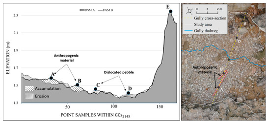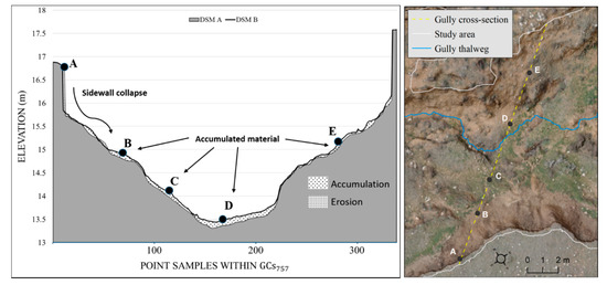 Gully erosion is one of the most prominent natural denudation processes of the Mediterranean [1,2,3,4,5,6,7,8,9], which causes significant soil degradation and sediment yield [10,11,12,13,14,15]. Active gullies tend to grow as long as predisposing factors, such as lithology, vegetation cover, land use, terrain attributes, and climatic factors, sustain erosion processes and soil removal [16,17,18]. Research about gully erosion is mostly aimed at quantification of different aspects of spatio-temporal changes in gully geometry, for instance, gully headcut retreat rate [4,15,19,20,21] or changes within gully cross-sections (GCs) [22,23,24,25]. Within this research, we concentrated on the accurate quantification of spatio-temporal changes in GCs as indicators of overall gully evolution. Spatio-temporal changes within GCs include all changes in cross-section geometry caused by erosion and/or accumulation processes that have occurred at the chosen study area, within a certain time period (e.g., day, month, year).