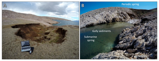 We assume that the strongest wave activity and related processes occur under the influence of Bora wind [89] which in this part of the Adriatic raises waves up to 7.2 meters [120]. Namely, Santiš is oriented in the NW direction and the average number of days with wind from the NE and NNE quadrant is 85.4 and 144.6 respectively, with a mean annual wind speed of 5.5 Bf and maximum of 30.4 Bf [97]. Field observations made a few days after the significant rain event in September 2017 (140 mm) proved the connection between rain-induced surface and subsurface runoff formation and reactivation of gully hydrological function. During the field survey carried out a few days after the significant rain event (140 mm), reactivation of spring at the pebble beach occurred, within the final part of the gully, along with the reactivation of nearby submarine springs (Figure 12B).