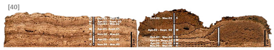 Plotted point samples from confirm that between two surveys, intensive headcut collapse occurred within these GCs (Figure 9A,D,F), as well as accumulation of eroded material at the headcut base (Figure 9B,C,E). Uphill progression of the gully headcut is also evident from the horizontal shift of the line representing headcut position in Survey A and in Survey B (Figure 9). Due to the erosion-induced material collapse mean linear gully headcut retreat (GHR) between Survey A and B was 10.85 ± 5 cm study period−1, while maximum values amounted up to the 49.71 ± 5 cm study period−1. Since these values represent the two-year period, the maximum annual GHR amounts to 24.85 ± 5 cm year−1. Determined annual GHR corresponds to the rates recorded in other researches, with similar conditions [15,115,116].