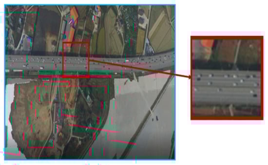 The video data used in this study consists of videos taken from UAV (drone) on roads in four sections of Republic of Korea (Namsa, Seohae Bridge, Noji, and Seonsan). The image size is , and the images were recorded at 30 frames per second (FPS) for eight to nine minutes (14,000 to 16,000 frames in total). Since UAV images are taken at high altitudes, about 80% of the original images contain surrounding structures or terrain, which are irrelevant to this study as they are not roads. Therefore, in this paper, we cropped the images to sizes of around the road area, as illustrated in Figure 2.