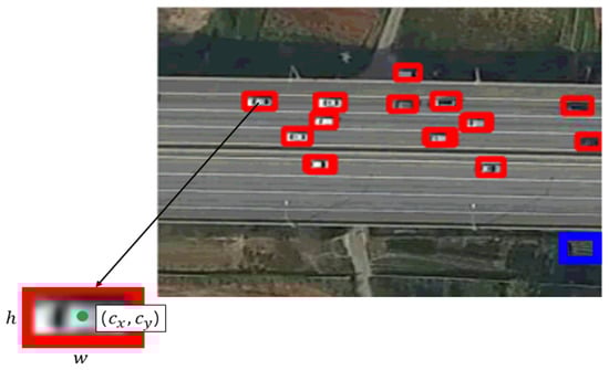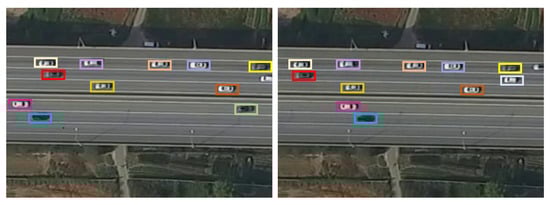 Based on the vehicle detection results for individual UAV image frames, we track the movements of each vehicle using SORT [30] Existing tracking methods, such as KLT-Feature Tracker [22], track objects by connecting identical pixel values between frames, which involves a relatively high computational cost because all pixels in the image must be compared; further, the performance is degraded when the pixel values of the same object change due to changes in lighting. By contrast, since SORT tracks the movement of an object using a bounding box that is a result of a vehicle (object) detector, the tracking speed is fast, and good object detection performance improves tracking performance. In Figure 4, the bounding box is represented in the form of , and represent the center coordinates of the object in the horizontal and vertical directions, respectively, and w and h represent the width and height of the bounding box, respectively. is the confidence score, which refers to the probability that the object being detected will be located within the bounding box. In Figure 5a,b, there is a time difference of 20 s, and the same colored bounding box in both figures means the exact vehicle.