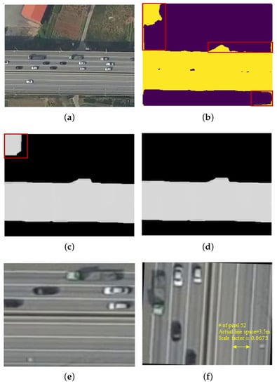 Figure 5 shows example images at each step of the pre-processing for lane detection. First, we segment the road area shown in Figure 5a using U-net [25] which is widely used as an image-segmentation network from UAV images containing surrounding areas other than roads. For the learning of U-net, we construct a training dataset for road segmentation by labeling only road areas (except for vehicles) on the whole road. The segmentation results by U-net were partially calibrated in pixels using image morphology [25] operations in Figure 5b. In the example sample in Figure 5c, two pixel clusters were created by U-net, in which case we remove a small pixel cluster based on prior knowledge about for road images. Figure 5d is a cropping of parts corresponding to the road area (large pixel cluster in Figure 5e and resizing it to a size of for Lane-Net use. Then, based on the vehicle movement direction obtained from the vehicle tracking results in Section 3.1, the image was rotated so that the lane in the image was in the longitudinal direction in Figure 5f.