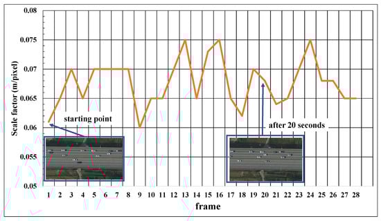 Figure 9 illustrates the result of calculating the scale factor of the image at 20-s intervals from a drone video of about 10 min of the ‘Seohae Bridge’ section. The horizontal axis in Figure 9 is an index of images sampled at intervals of 20 s, while the longitudinal axis is a scale factor estimated using the proposed method. As shown in Figure 9, the scale factor fluctuates between 0.06 and 0.075, depending on the frame; this is because the altitude of the drone changes due to the influence of wind or other factors during flight. We can see that the proposed method properly estimates the scale factor from the image based on the result, wherein the scale factor is large when the actual image is zoomed out and wherein the scale factor becomes small when zoomed in.