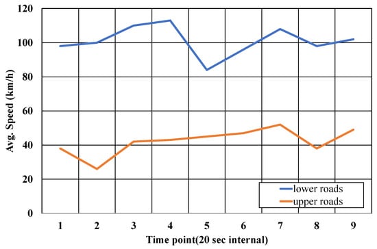 Figure 10 shows the average vehicle speed, which is automatically measured from drone images using the proposed method. The vehicle speeds of were measured in both directions of the road. As show in Figure 10, there is a slight change in the speed of the vehicle on the upper and lower roads over time. The difference in vehicle speed on the lower road is large compared to that on the upper road, because the speed result for the road is the average value of the speed of multiple vehicles on the road. In other words, the speeds of some vehicles significantly affect the overall measurement results on the lower road with fewer vehicles than the speeds of the same number of vehicles would on the upper road with many vehicles. Indeed, on a road with few vehicles, there is a relatively large speed difference between the passing lane.