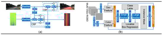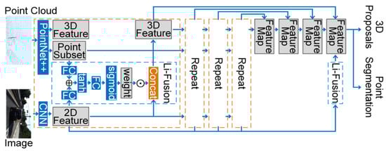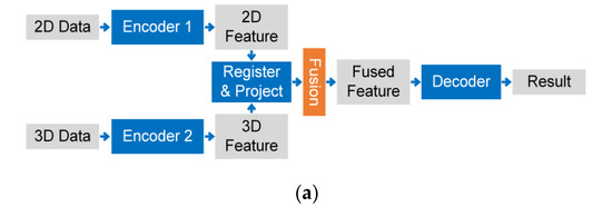 Thanks to the rapid development of deep learning [1,2] and various sensors, the techniques of the real-world scene sensing, analysis, and management are improved constantly, which potentially boosts the development of autonomous driving [3], robotic [4], remote sensing [5], medical science [6,7], the internet of things [8], etc. Therefore, the task of segmentation [9,10] and detection [11,12], the basic tasks of scene understanding, have achieved great improvements recently. However, the disadvantages of the methods based on a single kind of data have emerged gradually. For example, the image includes abundant 2D texture information but fails to represent the geometric information. Even though the 3D information can be acquired by post-processing the data collected by some mature visual-based perceptions, such as the mono- [13] and stereo camera [14], the quality of the geometric information are not reliable enough and the sensors always struggle with the light and weather conditions. Therefore, various 3D scanners have emerged to acquire more reliable geometric information. For example, LiDAR [15,16] is known as the long range of detecting, accuracy, and the robustness to different light and weather conditions. However, the point cloud struggles with the lack of fine texture due to the irregularity and the sparsity. To make the full use of the complementary feature of 2D and 3D data, information fusion is worth more research. The main challenges of 2D and 3D information fusion based on deep learning techniques are the complex correspondence between different data and their feature maps, and the suitable fusion strategy.