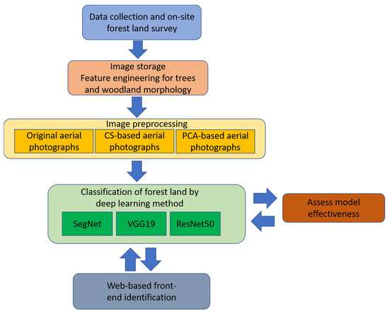 This research was conducted in the field of environmental resource management. The main technologies include numerical aerial photography technology, field plant survey technology, landscape and space statistical science, and image processing and analysis. We compared the stability, time consumption, and classification accuracy of three models (VGG19, ResNet50, and SegNet) by conducting experiments on two datasets (14 and seven forest and vegetation types) of three different photographs (original aerial photograph, CS-based aerial photograph, and PCA-based aerial photograph).