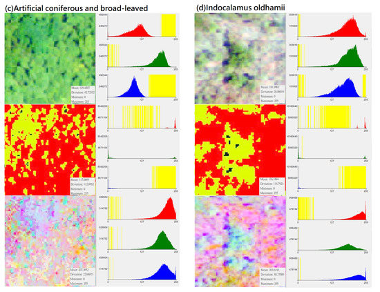 In the CS preprocessing process, researchers can use commonly used software such as ArcGIS or ENVI. In the process of ISODATA cluster method (e.g., unsupervised classification function in ArcGIS 10.1 geographic information software), regardless of the initial set number of classifications, this study used the “reclassify function” to divide its simplified classification into four categories: (1) darker black: “gaps between trees”; (2) whiter: “bare ground”; (3) bright green: “the light surface of the tree canopy”; (4) dark green: “the shadow surface of the tree canopy”. Compared with the noise problem faced when using high-resolution images for pixel-based classification, this setting can achieve an effect similar to segmentation for object-based image analysis (Table 7). Although the spectral distribution is narrower than the original image (Figure 3), the spatial distribution of the image can clearly show the tree shape and the positional relationship between the trees. Finally, by using this method, specific characteristics of different forest types and vegetation species were strengthened, and noise that may have influenced the input data was eliminated to improve the classification ability of deep learning algorithms.