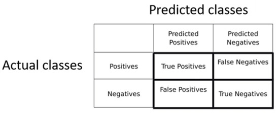We used mature models and the VGG 19, ResNet50, and SegNet modules with different types of images. The effectiveness of the models was verified. A confusion matrix was first generated from the predicted and actual categories. The matrix contains four elements (Figure 4): true positives (TP), true negatives (TN), false positives (FP), and false negatives (FN). Determining the effectiveness of the models using these values would be difficult; therefore, indicators such as recall, precision, and F1 score were used to evaluate the quality of the models. The formulas are shown in (2), (3), and (4).