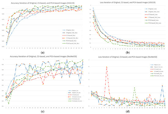 Regarding the accuracy and loss iterations of ResNet50 (Figure 5c,d), no matter the original image, when using CS- or PCA-based images, the curve was unstable, and the loss curve showed a slow linear decline and low learning rate. Taking the CS-based image as an example, its accuracy varied in the range 0.5–0.9 in 10–30 epochs. In the loss rate part, no matter what kind of input image was used, continuous and stable convergence was not shown, but when the training reached the 30th epoch, it showed that the performance of the PCA-based image was superior to that of the CS-based and original images. Furthermore, the trend of curve convergence was obvious. This meant that even if the simulation results were not good due to the influence of the model settings, PCA pre-processing for the image still effectively stabilized the model’s classification ability.