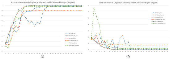 In Figure 5c, the represented CS-based image had a special impact on SegNet’s accuracy iteration due to the removal of too much available information. Whether the model was in the training or verification process, the accuracy rate only reached close to 90% in the end. However, the decline slope of the loss function curve was also obviously gentler, which meant that the model’s learning ability was obviously limited. The accuracy curve and loss function curve using the original image and PCA-based image occasionally fluctuated in the first half (0–15 epochs), but the overall convergence trend, highest accuracy rate, and the least loss were obvious in the second half (16–30 epochs). This meant that for users who pursue model stability and stable performance, the original image and PCA-based image with SegNet are also feasible choices.