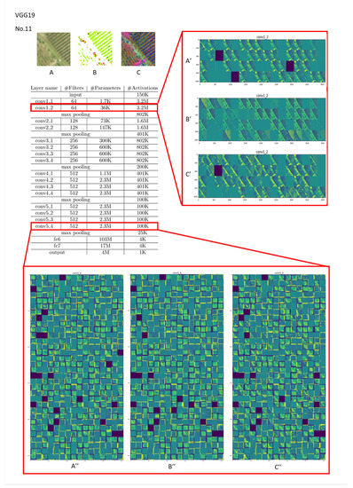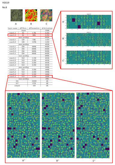 If the current CNN-based feature tracking method is applied to large areas and various types of image classification, it will still be affected by several obstacles. Most off-the-shelf CNN models obtain general representations of targets on large-scale image classification datasets. As we all know, different convolutional layers encode different types of features. Features taken from higher convolutional layers retain rich coarse-level semantics but are relatively less able to grasp accurate positioning or scale estimation. Conversely, features extracted from the lower convolutional layer retain more geometric structure to capture the spatial positions of specific targets, which helps to accurately locate target objects. However, if the objects to be classified have a high degree of feature similarity (such as in a plant canopy where most of the shapes are very similar and of various sizes), the higher the number of layers, the easier it is for weight values of different categories to become too close in the final classification weight calculation, resulting in false results. For example, as shown in Figure 8 and Figure 9, this study used VGG19 to train Cryptomeria Japonica (Type 8), which belongs to forestland, and tea plantations (Type 11), which belong to farming. The last layers of “conv1” and “conv3” produced larger differences between Types 8 and 11. However, when entering “conv5,” as subtle features and common features were successively proposed, the probability of the intermediate hidden layer being activated by ReLU and the sotfmax activation function also increased, which made the weighted sum of different classification categories quite close. As the number of layers increases, the probabilities of feature overlap and of classification weights being similar will increase significantly. This means that if the number of classifications increases, the increase in the number of convolutional layers of the CNN model may not necessarily effectively improve the classification performance. A CNN must rely on the feature space region to represent object-specific details for reinforcement or try to integrate multiple convolutional superior layers to improve the classification accuracy. Therefore, it can clearly explain why the accuracy of the seven classifications is better than that of the 14 classifications. In other words, to obtain better classification results, we must enhance or highlight the non-intersecting characteristics between different categories instead of simplifying the information. Therefore, the positive benefits of using CS data are minimal. Furthermore, if the input data are first converted by PCA, the differences between each grid in the activation layer during the convolution process will increase. The difference between the categories can be improved in the subsequent comparison of the weight difference. Essentially, although the CNN model has the ability to capture deep detailed features, it still needs to rely on feature combination or the large shallow features provided by the lower convolutional layer for advanced classification when facing objects with extremely similar details.