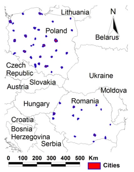 This study relied on spatial ‘land cover and use’ and ‘land cover and use changes’ data from the “Urban Atlas” for Poland and Romania. The two countries were chosen in order to illustrate the potential influence of a common recent history, followed by divergent post-socialist dynamics. The spatial data are freely available in a shape file format with the ETRS 1989 Lambert Azimuthal Equal Area L52 M10 projection from the Copernicus Land Monitoring Service website (https://land.copernicus.eu/, accessed on 27 September 2021). Three datasets reflected the 2006, 2012 and 2018 land cover and use, with a resolution of a minimum mapping unit of 250,000 m2, and a minimum width of linear elements of 100 m [42]. The two other datasets covered the changes from 2006–2012 and from 2012–2018, at a resolution of 2500 m2 for the artificial surfaces and 100 m2 for the other surfaces [43].