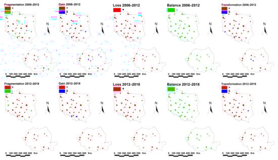 The present study was carried out in the cities represented in the Urban Atlas from 2006–2018; 32 cities in Poland, and 14 cities in Romania. The following results present an overall picture of the trends affecting OGA (fragmentation, gain, loss, overall balance, and inner transformation) in the studied cities, regardless of the values of the parameters. Additional details can be found in Table 4, and maps in Figure 2.