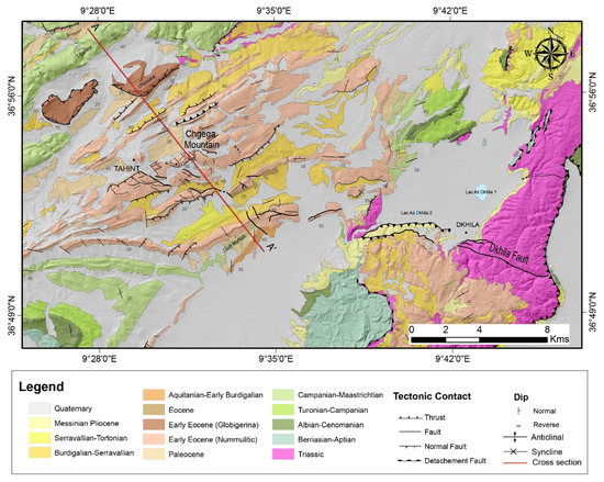 Chgega is a mountain culminating at 553 m.a.s.l. located in the Mateur region of Northern Tunisia, near Tahint village (Figure 1). From the geological viewpoint, Chgega forms part of the reliefs created by the Tell belt, formed by the Mesozoic and Cenozoic sedimentary cover of the Maghrebian Tethys realm, overthrusted and folded [23,24]. This belt, together with the Atlas belt further south, was produced in a context of NW-SE to N-S plate convergence between Africa and Eurasia since the late Cretaceous.