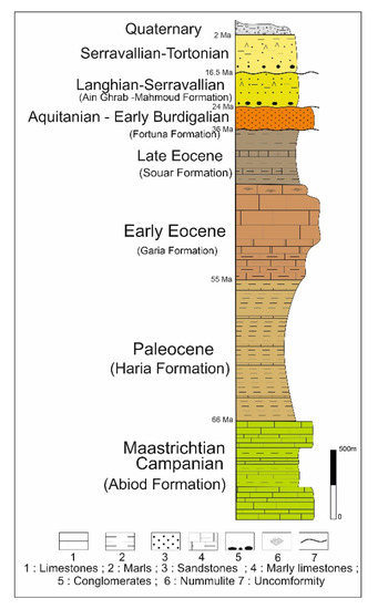 - Erraioui, L. Environnements Sédimentaires Et Géochimie Des Séries De l’Eocène Du Nord-Est De La Tunisie, Tunis (Tunisia); Thése de doctorat de spécialité, Université Tunis II, 1994; 244p. [Google Scholar]