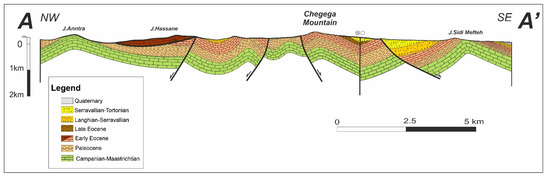 The topography of Northern Tunisia is therefore strongly influenced by this general convergent setting. However, it does not show the landscape characteristics of a mature orogenic belt with a well-developed transverse drainage system [15,25,26]. A smooth and low relief largely characterizes the entire region. Over this structural landscape, the greatest reliefs coincide with anticlinal ridges or the hanging wall of shortening structures; in turn, the topographic depressions and axial valleys occur in relation to synforms and the footwall of reverse faults [15,27,28]. Large NE-SW oriented axial valleys such as the Mejerda, Tine, Joumine, and Ghezala river valleys run parallel to the main shortening structures, e.g., the Alia-Thibar fault zone [28]. The landscape is furthermore influenced by rheological contrasts between competent and incompetent lithologies—respectively, limestones and pelites. For instance, the folded region where Chgega Mountain is situated shows a differential relief marked by the erodibility contrast between the Early Eocene nummulitic limestones of the Garia Formation and the Palaeogene or Late Eocene clays and marls of the Haria and Souar Formations, respectively [29,30] (Figure 2 and Figure 3). Miocene half-grabens subparallel to the fold hinges in the region further stand out against the Eocene limestones in the uplifted footwall of the normal faults [31].