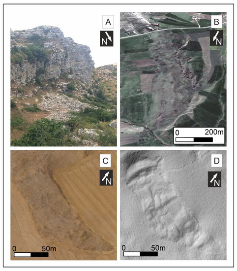 Landslide types observed in the region of Mateur. (A) Rockfall deposits at the foot of a scarp in the limestones of the Garia Formation. (B) Slow-moving flow developed in clays of the Haria Formation (Source: Google Earth™). (C,D) Orthoimage (C) and hillshade model (D) of a flow that occurred in a cereal crop adjacent to Chgega Mountain. Images obtained from the 3D model created in this study (see following sections for more details).