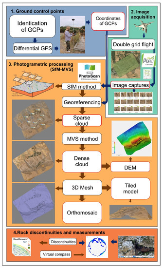 Flow diagram of the UAV survey, 3D model production, and discontinuity investigations.