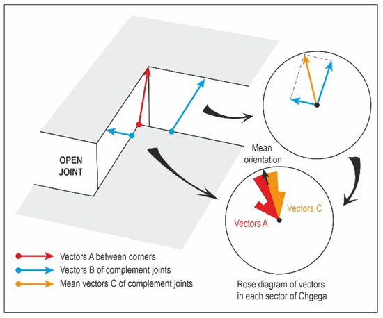 Figure 7 outlines the procedure used to calculate the mean vectors of movement. First, we recognized rock corners in the two margins of the joints that matched perfectly, and we measured the azimuth of the line connecting these corners. Second, we measured pairs of azimuths in complementary joints where clear corners were not present. These azimuths were those of the lines perpendicular to the joints. The mean azimuth of these lines marks the azimuth of the joint opening in this case. We measured discontinuities with openings clearly recognizable in the orthoimage (resolution: 8.19 cm/pix). The aperture is generally of more than 50 cm.