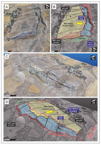 Virtual oblique aerial views of Chgega landslide from the Southwest (A,B) and from the East (C,D). The main morphological features of the complex landslide and the geological structures are highlighted in B and D. G: Garia Formation; H: Haria Formation. The views were generated using the 3D model produced by means of SfM methods.