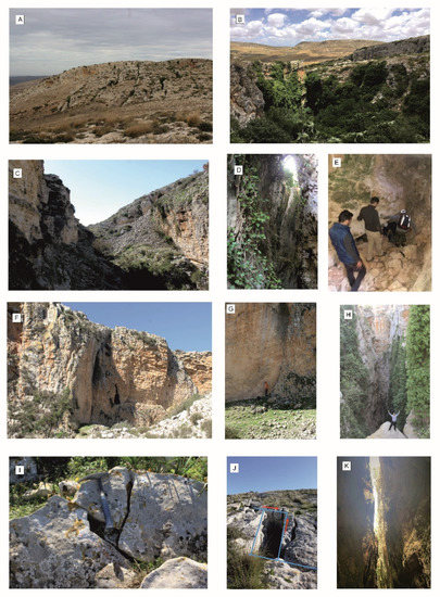 Photographs of various sectors of the Chgega Mountain. (A) Open joints in the southwestern sector. (B) Deep trench in the northeastern sector. (C) Interior of the gravity-induced graben where tilted blocks and rockfall deposits are observed. (D) View of a deep open fracture from its bottom. (E) Entrance to crevice-type cavities. (F) Rock walls forming the boundary of the graben. The center cliff is formed by fault breccia. (G) Slickenside cropping out in the graben. (H) Deep open fracture in the eastern sector. (I,J) Main discontinuity sets observed in the Chgega Mountain. (K) Narrow passage through an open fracture.