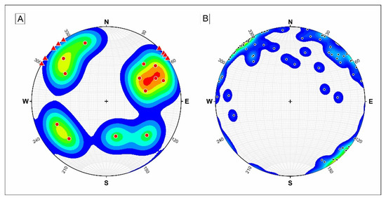 Stereonets of the main rock discontinuities observed in the Chgega Mountain (pole faults in circle and joints in triangle). The diagrams were elaborated on the basis of field measurements (A) and virtual measurements using a compass (B).