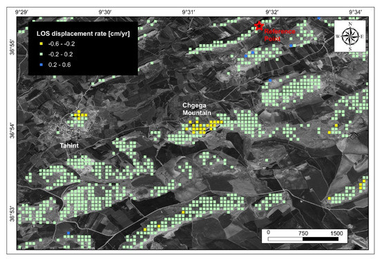 We processed 24 Sentinel-1A images acquired between 15 April 2015 and 19 January 2020 (4.7 years) by means of a multi-temporal method. The mean temporal sampling was 70 days, the coherence threshold was set at 0.95, and the reference point was situated 3 km away from Chgega Mountain at the following coordinates: Latitude 36.92511, Longitude 9.5369546 (WGS84 projection).