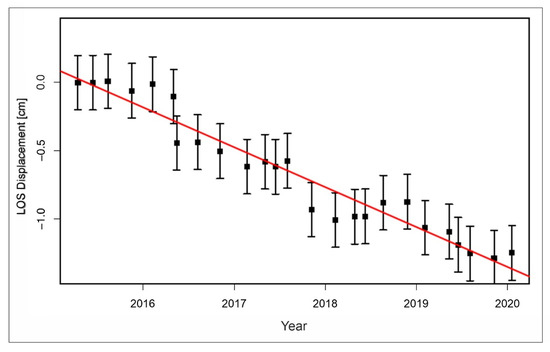 We carried out DInSAR analysis by taking advantage of a powerful SAR image-processing tool implemented in a web platform of the European Space Agency (ESA). This tool is the Parallel Small Baseline Subset (P-SBAS) processing service of the Geohazards Exploitation Platform (GEP) [51,52,53]. We selected from this platform SAR images with a descending orbit, as the corresponding geometry proves most adequate to obtain sound results for the Chgega landslide. The landslide is moving towards the NW and the Line of Sight (LOS) of the satellite has roughly the same orientation.